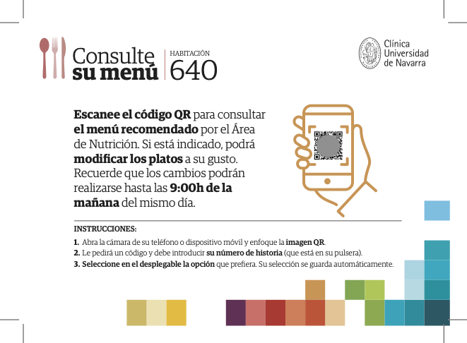Así, los pacientes que lo deseen puede escanear el QR con su dispositivo móvil y tras una rápida validación acceden a su menú de hoy y de los próximos días. CUN ha aplicado una restricción de plazo para limitar los cambios de última hora de los pacientes (la restricción menos restrictiva de todos nuestros hospitales, en línea las políticas de atención al cliente de CUN).